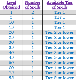 Messorem use Dark Magic to cast their spells, but this spell power is stolen. It can only be recovered by “Condemning” a living target while your Magic Conuit is equiped. You will recover 1d6 spell power (+1d6 per 5 Messorem levels). You can only cast spells if your Magic Conduit is equiped. Messorems learn spells according to the chart below.