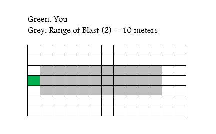 This is a special kind of range refered to as a “blast range”. These types of spells affect a large area in a direction of the casters choosing. For this example, let’s say that “x” is 2, and “y” is 10; this would give us “Blast (2) = 10 meters. When using a spell with this range, you will choose a direction originating from yourself, and extended 10 meters in a straight line in the chosen direction. Now that the normal range has been establsihed, lets look at the other part; “Blast (2)”. This is how many meters around the line that are also affected. With “Blast (2)”, everything within 2 meters to either side of the line will also be affected by the spell. Refer to the image below. Everything within range is affected by the spell.